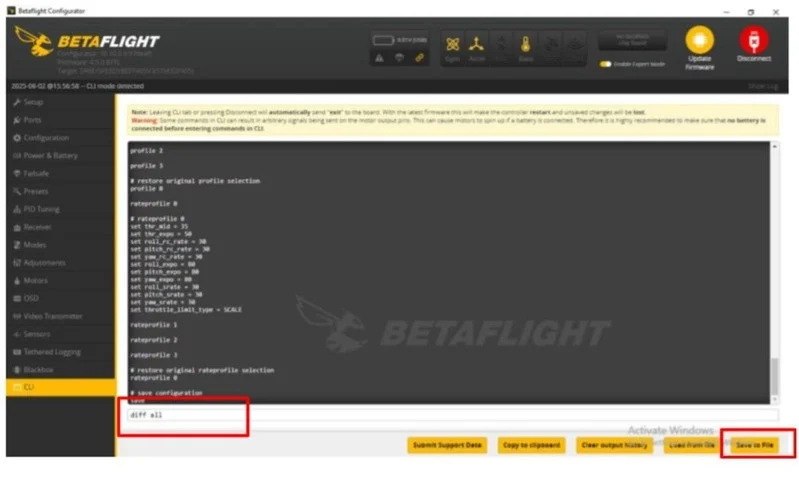 Робимо бекап налаштувань на дроні через команду diff all в CLI
