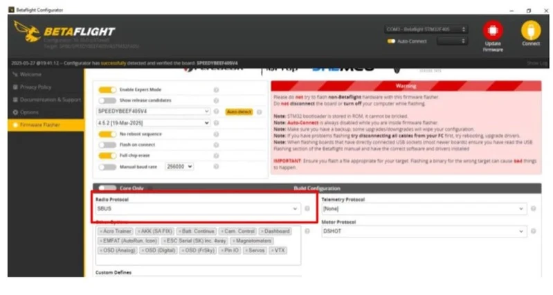Прошиваємо політний контролер на потрібну версію та у налаштуваннях вибираємо Radio Protocol: SBUS