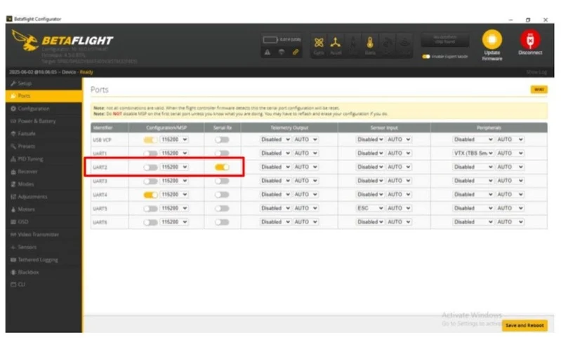 Вибираємо UART2 в налаштуваннях портів та вмикаємо Serial RX. Після прошивки дрона відновлюємо його налаштування в CLI.